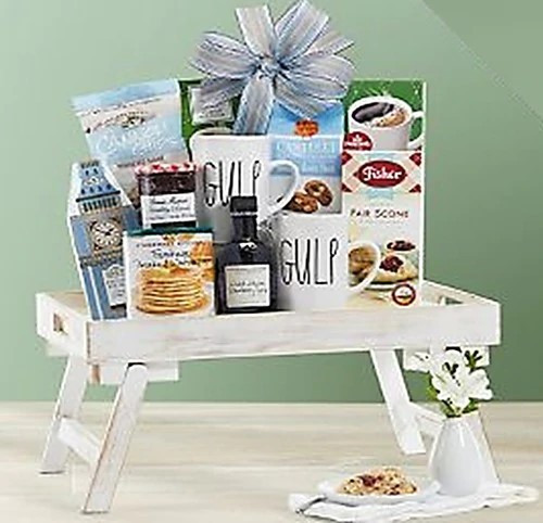 Start their day off right with this wooden breakfast tray brimming with Stonewall Kitchen pancake and waffle mix, blueberry syrup, scone mix, strawberry preserves, cookies, coffee, hot cocoa, tea and two oversized mugs so they can share the joy of this morning pick-me-up. We will complete this gift with a gorgeous bow along with your message on a free greeting card. Printed ribbon is available for an additional fee.