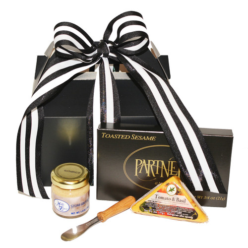 This black gable box includes toasted sesame crackers, a mini knife, tomato and basil cheddar cheese and a mini mustard. A great favor, amenity gift or simple thank you. We'll finish this gift with a gorgeous bow along with your message on a greeting card. Printed ribbon is available for an additional fee.